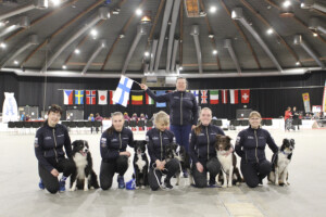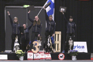 Suomen joukkue puhalsi yhteen hiileen ja kaikki tukivat toisiaan. Jaoimme tehtävät, ja jokainen osallistui innolla ja tarkkuudella. Kaikkia kannustettiin ja tuettiin kaikissa mahdollisissa asioissa, olipa kyse esiintymiskampauksen tekemisestä tai koiran vesikupin kantamisesta lämmittelykehään.