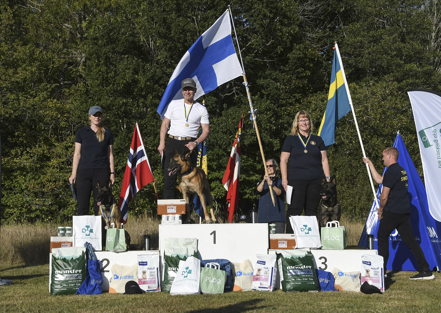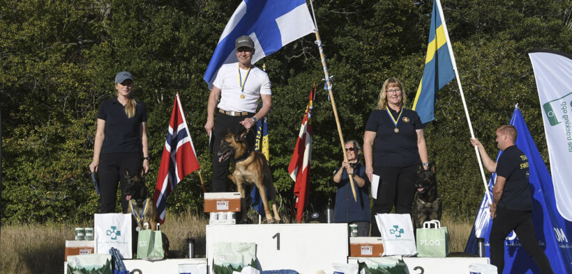 Juha Korri sai kultamitalin IGP:n NOM- eli Pohjoismaiden mestaruuskilpailussa koiransa Tämä On Koneen kanssa. Toiseksi sijoittuivat Ruotsin Matilda Edblom ja Civan Av Schwarz Engeln, kolmanneksi Ruotsin Ingela Karlsson ja Mi-Jos Tyrann af Trilska. Kuva: Anette Björkman Bergström