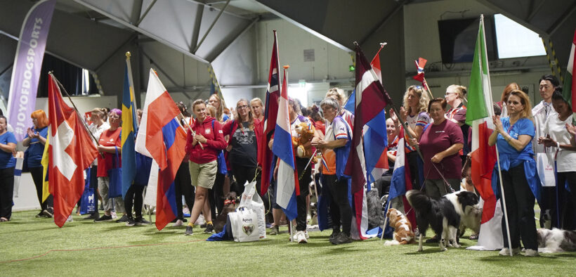 Kaikkien maiden edustusjoukkueet kokoontuivat koiratanssin MM-kilpailujen palkintojenjakoon. Kuva: Seppo Jounio