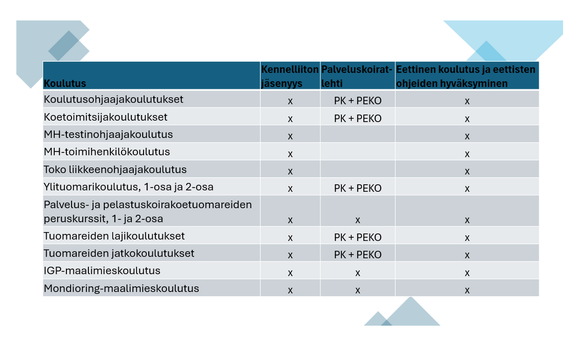Taulukosta näet, mitkä koulutukset edellyttävät Kennelliiton jäsenyyttä, eettisen koulutuksen suorittamista tai Palveluskoirat-lehden tilausta. Kurssikohtaiset edellytykset kokonaisuudessaan löytyvät Palveluskoiraliiton verkkosivuilta.